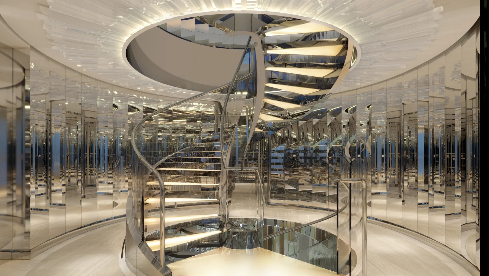 Najbardziej spektakularnym elementem projektu pozostaje Funnel Suite – apartament wkomponowany w strukturę komina jednostki. Rozciąga się on na cztery poziomy i oferuje około 930 metrów kwadratowych przestrzeni. To czyni go jednym z największych tego typu apartamentów na morzu. Znajduje się tu również jedna z największych ciągłych przeszklonych powierzchni w branży, zapewniająca około 280-stopniowy panoramiczny widok na horyzont.